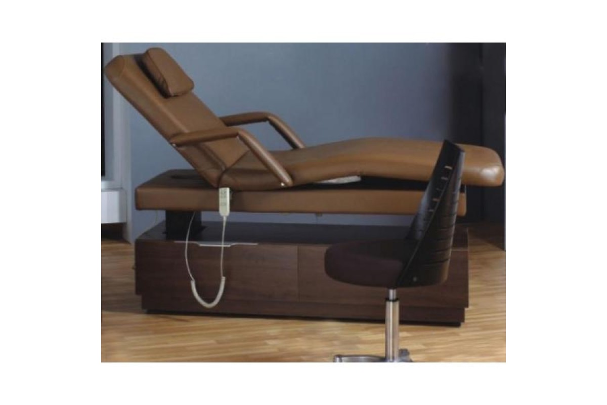 Обшивка кушетки сделана из кожзаменителя класса люкс, имеет классический ореховый цвет. Деревянное основание имеет два выдвижных ящика-органайзера, в них удобно хранить различные принадлежности. Вырез для лица в верхней части, прячет мягкая подушечка. Подлокотники регулируемые и съемные. Кушетка регулиркется по высоте с помощью пульта управления.